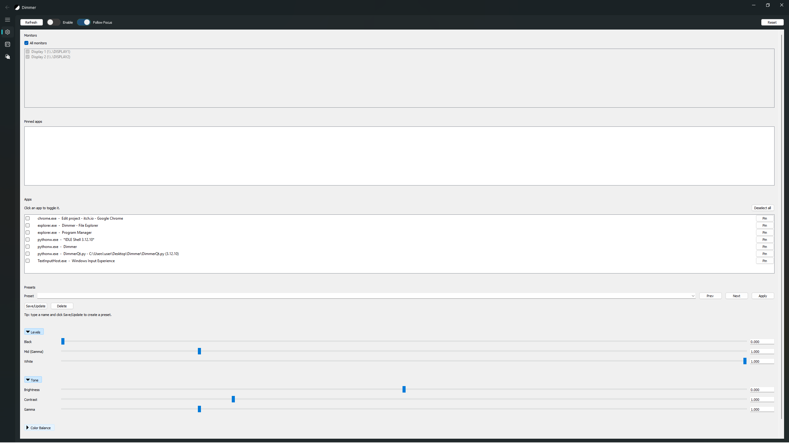 Dimmer lets you adjust brightness, contrast, gamma, and color balance per monitor or per app, then toggle the effect instantly with global hotkeys.
